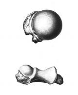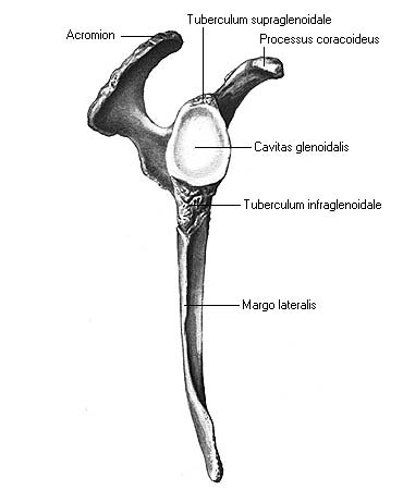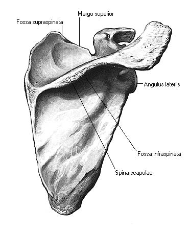 Лопатка, scapula, плоская кость. Она располагается между мышцами спины на уровне от II до VIII ребер. Лопатка имеет треугольную форму и соответственно в ней различают три края: верхний, медиальный и латеральный и три угла: верхний, нижний и латеральный. Верхний край лопатки, margo superior scapulae, истончен, имеет в своем наружном отделе вырезку лопатки, incisura scapulae: над ней на немацерированной кости натянута верхняя поперечная связка лопатки, lig. transversum scapulae superius, образующая вместе с этой вырезкой отверстие, через которое проходит надлопаточный нерв, nervus suprascapularis. Наружные отделы верхнего края лопатки переходят в клювовидный отросток, processus coracoideus. Начальный отдел отростка направляется вверх, затем он изгибается под углом и следует вперед и несколько кнаружи. Медиальный край лопатки, margo medialis scapulae, длиннее и тоньше верхнего. Он обращен к позвоночному столбу и хорошо прощупывается через кожу. Латеральный край лопатки, margo lateralis scapulae, утолщен, направлен в сторону подмышечной области. Верхний угол, angylus superior, закругленный, обращен вверх и медиально. Нижний угол, angulus inferior, шероховат, утолщен и обращен вниз. Латеральный угол, angulus lateralis, утолщен. На его наружной поверхности располагается уплощенная суставная впадина, cavitas glenoidalis, с которой сочленяется суставная поверхность головки плечевой кости. Латеральный угол лопатки отделяется от остальной ее части небольшим сужением — шейкой лопатки, collum scapulae. В области шейки над верхним краем суставной впадины располагается надсуставной бугорок, tuberculum supraglenoidale, а ниже суставной впадины — подсуставной бугорок, tuberculum infraglenoidale, (следы начала мышц). Передняя, реберная поверхность, facies costalis, вогнута, заполнена подлопаточной мышцей, m. subscapularis, и носит название подлопаточной ямки, fossa subscapularis. Задняя, дорсальная поверхность, facies dorsalis, посредством ости лопатки, spina scapulae, разделяется на две части: одна из них меньшая, располагается выше ости и носит название надостной ямки, fossa supraspinata, другая, большая, занимает остальную часть задней поверхности лопатки и носит название подостной ямки, fossa infraspinata, в этих ямках начинаются одноименные мышцы. Ость лопатки, spina scapulae, представляет собой хорошо развитый гребень, который пересекает заднюю поверхность лопатки от ее медиального края в сторону латерального угла. Латеральный отдел ости лопатки сильнее развит и переходит в плечевой отросток, или акромион. acromion, который направляется кнаружи и немного вперед и несет на своем переднем крае суставную поверхность акромиона, facies arti-cularis acromii. для сочленения с ключицей.