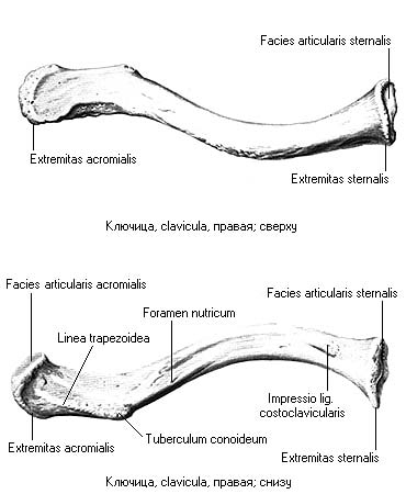 Ключица, clavicula небольшая трубчатая кость S-образной формы. Она имеет тело и два конца: Грудинный, обращенный к рукоятке грудины, и акромиальнын, соединяющийся с акромионом лопатки. Грудинный конец ключицы и прилегающий к нему участок тела изогнуты выпуклостью вперед, а остальная часть ключицы изогнута выпуклостью назад. Средний участок ключицы, расположенный между ее концами, несколько сдавлен сверху вниз. На его нижней поверхности находится сравнительно крупное питательное отверстие. У грудинного конца располагается вдавление реберно-ключичной связки, impressio lig. costoclavicularis, а у плечевого конца — конусовидный бугорок и трапециевидная линия, tuberculum соnoideum et tinea trapezoidea (места прикрепления конической и трапециевидной частей клюво-ключичной связки, lig. сога-coclaviculare).Верхняя поверхность ключицы гладкая. Грудинный конец, extremitas sternalis, утолщен и несет на своей внутренней поверхности грудинную суставную поверхность, facies articu-laris sternalis, место сочленения с ключичной вырезкой на рукоятке грудины. Акромиальный конец, extremitas acromialis, ключицы шире грудинного, но несколько тоньше его. На наружнонижней части этого отростка располагается акромиальная суставная поверхность, facies articularis acromialis, сочленяющаяся с акромионом лопатки.