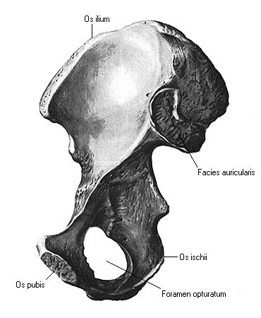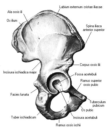 Тазовая кость, os coxae, парная, в раннем детском возрасте состоит из трех отдельных костей: подвздошной, os ilium, седалищной, os ischii, и лобковой, os pubis. У взрослого эти три кости срастаются в единую тазовую кость, os coxae. Тела этих костей, соединяясь между собой, образуют на наружной поверхности тазовой кости вертлужную впадину, acetabulum. Подвздошная кость образует верхний отдел вертлужной впадины, седалищная — задненижний и лобковая кость -передненижний отделы. В процессе развития в каждой из этих костей возникают самостоятельные точки окостенения, так что до 16—17-летнего возраста в области вертлужной впадины подвздошная, седалищная и лобковая кости соединяются при помощи хряща. В дальнейшем хрящ окостеневает и границы между костями сглаживаются. Вертлужная впадина, acetabulum, ограничена утолщенным краем, который в передненижнем отделе перерывается вырезкой вертлужной впадины, incisura acetabuli. Кнутри от этого края внутренняя поверхность вертлужной впадины несет гладкую суставную полулунную поверхность. facies lunata, которая ограничивает находящуюся на дне acetabulum ямку вертлужной впадины, fossa acetabuli.