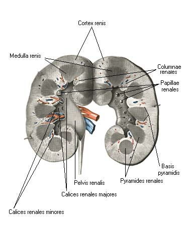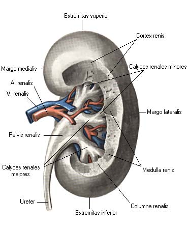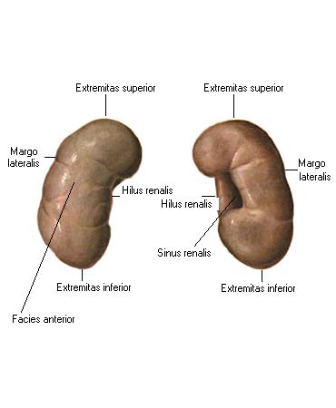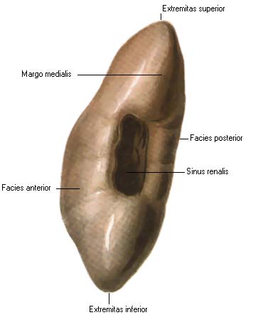 Почка, геп — парный орган бобовидной формы. Почки располагаются в полости живота, в поясничной области, по обе стороны от позвоночника. Каждая почка достигает в длину 10—12 см, в ширину 5—6 см, в толщину 4 см. Масса одной почки 120—200 г. Левая почка несколько длиннее правой и иногда имеет большую массу. Цвет почек чаще темно-коричневый. Каждая почка имеет переднюю и заднюю поверхности, латеральный и медиальный края, верхний и нижний концы. Передняя поверхность, facies anterior, выпуклая и обращена несколько латерально. Верхние г/, правой почки прилегают к печени, а верхняя треть левой почки — к желудку. Задняя поверхность, facies posterior, уплощена. Боковой участок каждой почки прилегает к квадратной мышце поясницы. Латеральный край, margo lateralis, выпуклый и обращен несколько к задней стенке живота; медиальный край, margo medialis. вогнут и обращен вниз, медиально и вперед. На середине медиального края почки имеется углубление -почечные ворота, hilus renalis, которое переходит в почечную пазуху, sinus renalis. Ворота почки спереди образованы более узкой передней губой, а сзади более широкой задней губой. В результате этого задняя поверхность почки шире передней, а почечная пазуха больше обращена кпереди. В почечной пазухе находятся почечная лоханка, pelvis renalis, почечные чашки, calyces renales, ветви почечных сосудов и нервов, лимфатические узлы и жировая клетчатка. Взаиморасположение вступающих в ворота перечисленных образований таково, что вены залегают впереди, артерии и нервы — позади вен, а почечная лоханка и мочеточник — кзади от артерий. Верхний конец почки, extremitas superior, шире и площе, чем нижний конец, extremitas inferior. Верхние концы несут на себе надпочечники, glandulae suprarenales. Эти концы ближе к срединной плоскости тела, чем нижние; последние более отклонены от позвоночника. В каждой почке различают следующие почечные сегменты, segmenta renales: верхний сегмент, segmentum superius, соответствует медиальной и частично передней поверхности верхнего конца почки; верхний передний сегмент, segmentum anterius superius, располагается впереди почечной лоханки, включая в себя переднюю поверхность верхнего конца, верхнего отдела средней части почки, латеральный край и частично заднюю поверхность; нижний передний сегмент, segmentum anterius inferius. лежит также впереди почечной лоханки, выходя на переднюю поверхность почки в нижнем отделе ее средней части и частично на заднюю поверхность; нижний сегмент, segmentum inferius, занимает нижний конец почки; задний сегмент, segmentum posterius, лежит позади почечной лоханки и соответствует задней поверхности почки между верхним сегментом сверху, нижним — снизу, верхним и нижним передними сегментами — латерально. Каждая почка окружена жировой капсулой и почечной фасцией. Жировая капсула, capsula adiposa, непосредственно одевает почку, покрывая более толстым слоем заднюю поверхность; через почечные ворота она проникает в почечную пазуху. Почечная фасция, fascia renalis, представляет часть забрю-шинной фасции, fascia retroperitonealis; у ворот почки почечная фасция делится на две пластинки: переднюю, или предпочечную, пластинку, lamina prerenalis, и заднюю, или по-задипочечную, пластинку, lamina retrorenalis; пластинки охватывают почку с жировой капсулой, а также расположенный на верхнем конце почки надпочечник и почечные сосуды и нервы. Медиальнее почки задний листок фасции простирается по поверхности тел позвонков; передний же листок переходи