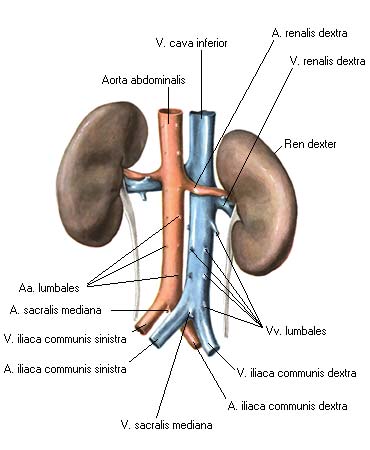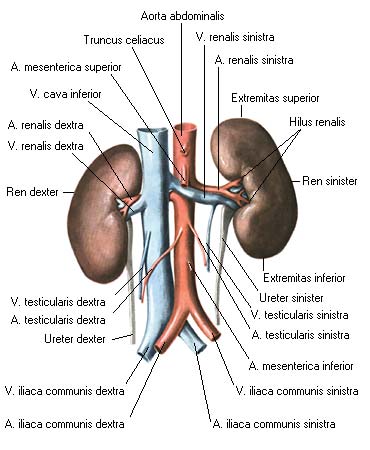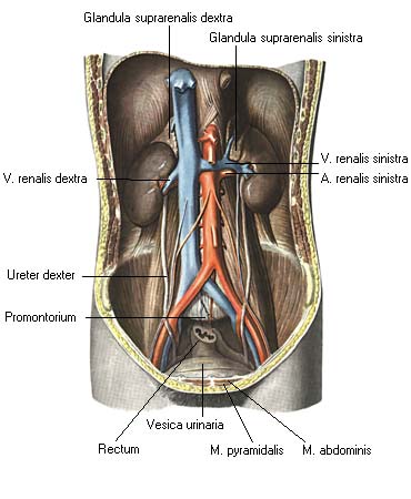 Мочеточник, ureter, парный, представляет забрюшинно расположенный трубчатый орган, сообщающий почечную лоханку с мочевым пузырем. Длина мочеточника 30—35 см, диаметр неравномерный; у места отхождения от лоханки, при входе в малый таз и при прохождении через стенку мочевого пузыря он равен 3—4 мм, а между этими суженными местами диаметр его достигает 9 мм. Различают две части мочеточника: брюшную и тазовую. Брюшная часть, pars abdominalis, у места отхождения от лоханки образует изгиб. Поворачивая вниз и медиально, мочеточник проходит по передней поверхности большой поясничной мышцы вниз до пограничной линии таза. Тазовая часть, pars pelvina, ложится под брюшиной малого таза, поворачивает вперед, медиально и вниз. Достигнув дна мочевого пузыря, мочеточник пронизывает его стенку в косом направлении и открывается в полость пузыря щелевидным отверстием. Стенка мочеточника состоит из трех слоев: соединительно-тканной, адвентициальной оболочки, мышечной оболочки и слизистой оболочки. Адвентициальная оболочка, tunica adventitia, состоит из волокнистой соединительной ткани с примесью эластических волокон. В толще клетчатки проходят нервы и сосуды мочеточника. Мочеточник окружен слаборазвитой фасцией, являющейся продолжением почечной фасции. Мышечная оболочка, tunica muscularis, состоит из трех слоев: внутреннего продольного, среднего циркулярного и наружного продольного. При этом последний не сплошной, а представлен отдельными пучками, которых больше в нижней части мочеточника. Слизистая оболочка, tunica mucosa, образует продольно идущие складки, в результате чего просвет мочеточника имеет звездообразную форму; ближе к нижним участкам мочеточника складки сглаживаются и просвет теряет указанную форму. В толще слизистой оболочки, преимущественно в верхней части мочеточника, встречается небольшое количество маленьких трубчато-альвеолярных желез. Топографические взаимоотношения брюшного отдела правого и левого мочеточников неодинаковы. Правый мочеточник в начальной части располагается позади нисходящей части двенадцатиперстной кишки. Нижняя часть брюшного его отдела пересекает корень брыжейки подвздошной кишки. На уровне пограничной линии он проходит впереди общих подвздошных сосудов. Левый мочеточник в начальном отделе проходит позади flexura duodenojejunalis, а при переходе в малый таз перекрещивает наружные подвздошные сосуды. Правый и левый мочеточники в области середины или верхней трети их протяжения перекрещивают яичковые или яичниковые сосуды. Топографические взаимоотношения внутритазовой части справа и слева одинаковы, но различны у мужчин и женщин. У мужчин непосредственно перед вхождением в пузырь мочеточник перекрещивается семявыносящим протоком, который ложится здесь медиально от него; место вхождения в мочевой пузырь располагается несколько ниже дна прямокишечно-пузырного углубления и соответствует верхушке семенного пузырька. У женщин мочеточник, спускаясь по стенке малого таза, перекрещивает, располагаясь поверхностнее, начало маточной артерии; далее, направляясь медиально, вниз и вперед, он проходит в околоматочной клетчатке и здесь, на уровне шейки матки, перекрещивает маточную артерию, располагаясь ниже ее. Еще далее кпереди мочеточник пересекает переднебоковую стенку влагалища и входит в мочевой пузырь. Иннервация: plexus renalis, hypogastric