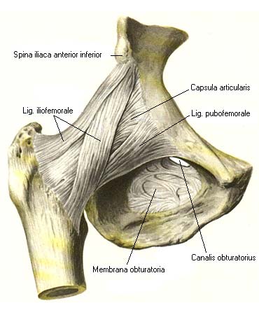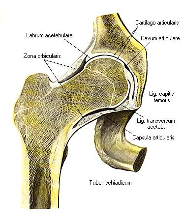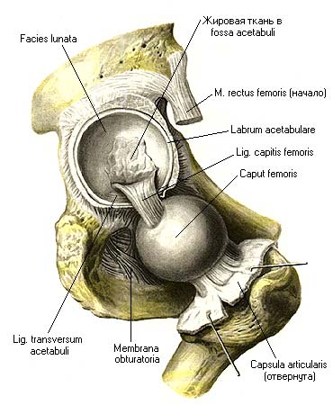 Тазобедренный сустав, articulatio coxae, образован суставной поверхностью головки бедренной кости, которая покрыта гиалиновым хрящом на всем протяжении, за исключением fovea capitis, и вертлужной впадиной, acetabulum, тазовой кости. Вертлужная впадина покрыта хрящом только в области полу лунной поверхности, facies lunala, а на остальном протяжении она выполнена жировой клетчаткой и покрыта синовиальной оболочкой. Над incisura acetabuli натянута поперечная связка вертлужной впадины, lig. transversum acetabuli. По свободному краю впадины и указанной связки прикрепляется вертлужная губа, labrum acetabulare, которая несколько увеличивает глубину вертлужной впадины. Суставная капсула, capsula articularis, прикрепляется на тазовой кости по краю labrum acetabulare, на бедренной-фиксируется по linea intertrochanterica, а сзади захватывает 2/3 шейки бедренной кости и не доходит до crista intertrochanterica.