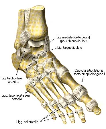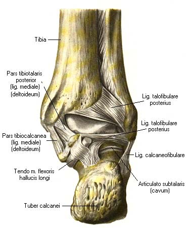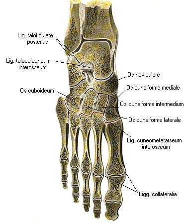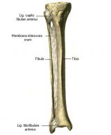 Проксимальные концы костей голени образуют межберцовый сустав, articulatio tibiofibularis. Суставные поверхности сустава представлены плоскими поверхностями головки малоберцовой кости, facies articularis capitis fibulae, и латерального мыщелка большеберцовой кости, facies articularis fibularis. Суставная капсула, capsula articularis, прикрепляется по краю суставных поверхностей, туго натянута и подкрепляется передней и задней связками головки малоберцовой кости, ligg. capitis fibulae anterius et posterius. Связки располагаются на передней и задней поверхностях сустава и направляются от большеберцовой кости к головке малоберцовой. Проксимальное сочленение берцовых костей относится к малоподвижным суставам. Межкостный промежуток между костями голени заполнен межкостной перепонкой голени, membrana interossea cruris. Волокна перепонки следуют сверху вниз и латерально от межкостного края большеберцовой кости к одноименному краю малоберцовой кости. В верхнем отделе перепонки имеется крупное отверстие, пропускающее сосуды и нерв, а в нижнем -небольшое отверстие, через которое проходят сосуды. В нижнем отделе перепонка более прочна. Дистальные концы костей голени образуют межберцовый синдесмоз (сустав), syndesmosis (articulatio) tibiofibularis. На передней и задней поверхностях этого соединения находятся короткие, но крепкие связки, натянутые от переднего и заднего краев incisura fibularis tibiae к латеральной лодыжке. Это передняя и задняя межберцовые связки, ligg. tibiofibularia anterius et posterius. Кроме того, плотные пучки соединительнотканных волокон натянуты на всем протяжении между incisura fibularis tibiae и обращенной к ней шероховатой поверхностью латеральной лодыжки.